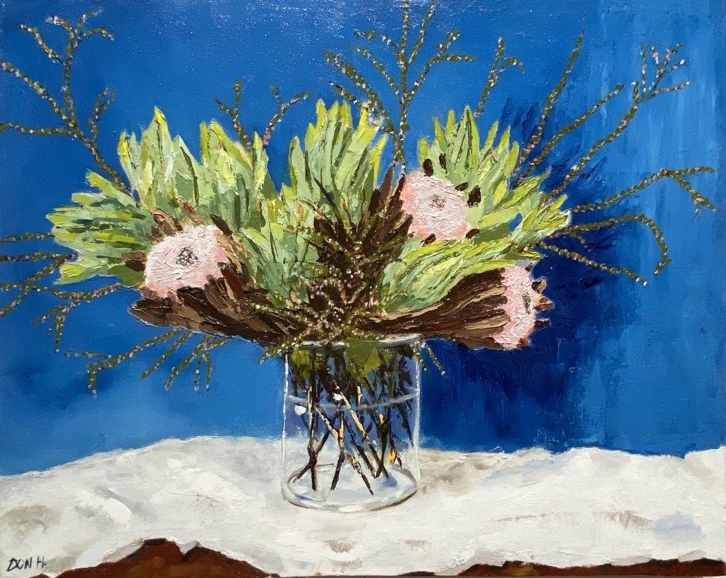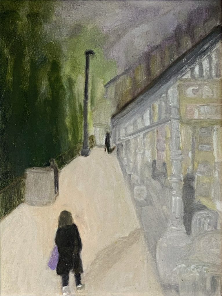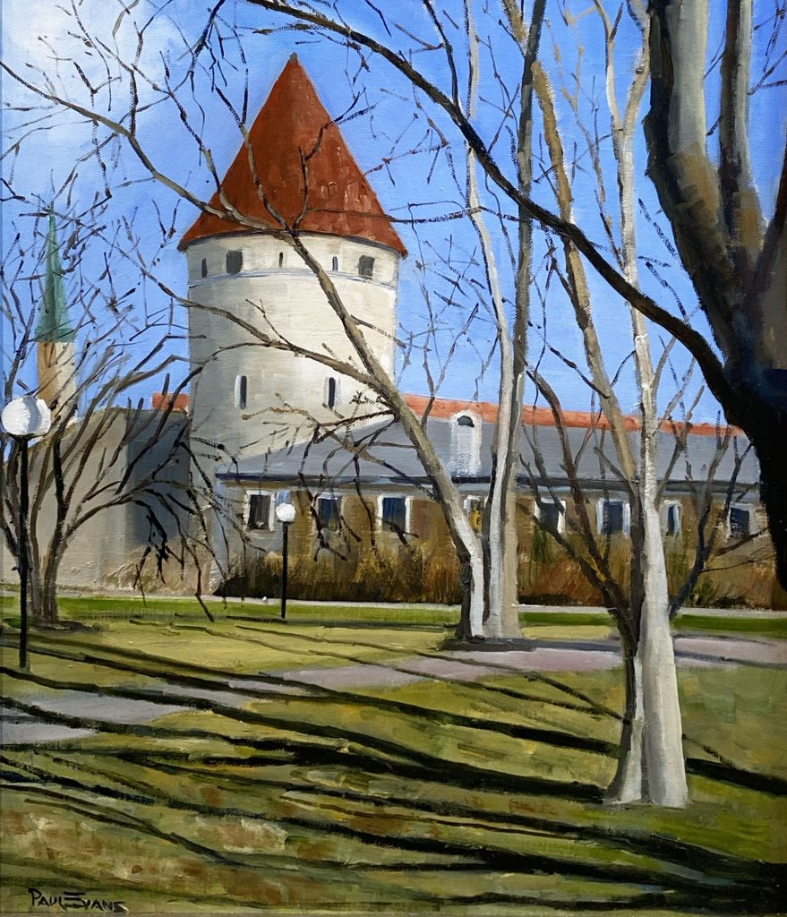Excellent composition; the artist leads the viewer’s eye around the full canvas employing visual pathways and balance. The long shadows and cool colours evoke a chilly, but bright, northern European day, and the shadowed areas of the branches are well executed.