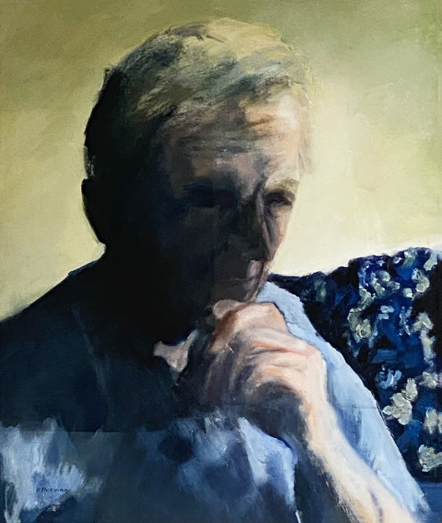 Well executed, the work conveys tenderness and warmth. A lack of sharpness suggests the split second before the sitter shifts and sits back, while the triangle of pattern at the mid to lower right mirrors an inverse triangle created by the back of the sitter’s neck.