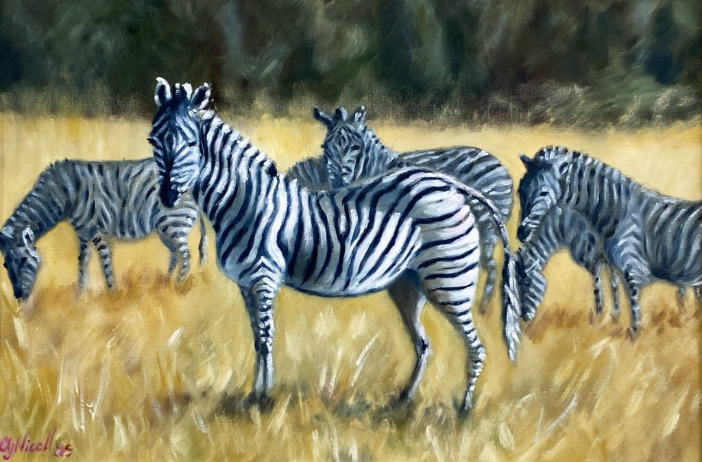 Well-rendered beasts with their monochrome patterned bodies sit calmly in striking contrast to an unfocused background. The warmth of the day is evident through the choice of colour palette, and the languid repose of the animals.