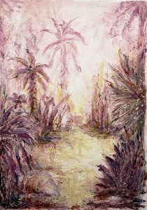 A diamond-shaped centre path leads the way into a smokey pink haze, and into the antithesis of a focal point, where a focus point ordinarily ought to be. The artist has created beautifully textured foliage through lovely use of brush strokes and mark making.